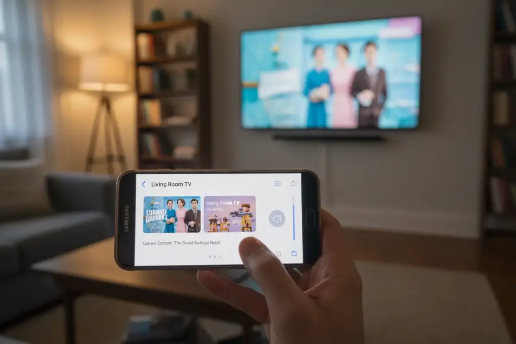 Primeiramente, tanto a TV Samsung quanto o seu celular devem estar conectados à mesma rede Wi-Fi doméstica.